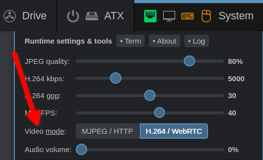 To receive and transmit audio in the PiKVM Web UI, go to the System menu and switch the video mode to WebRTC.